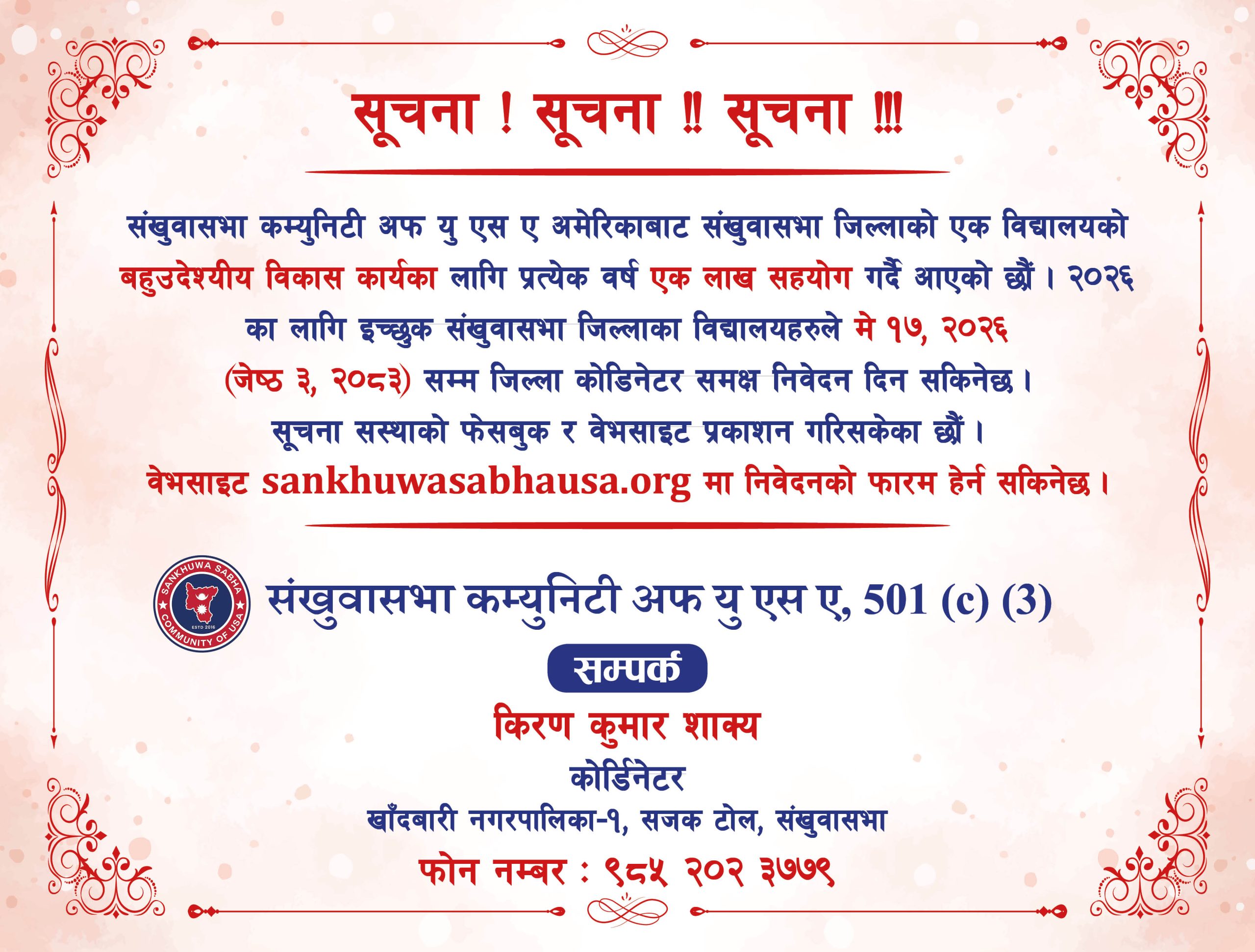 संखुवासभा कम्युनिटी अफ यु एस ए ,अमेरिका बाट संखुवासभा जिल्लाका एक बिद्यालयको बहु उदेश्यीय बिकास कार्यमा सहयोग पुर्याउन प्रत्येक बर्ष नेपाली रुपया एकलाख वितरण गरिने हुदा संखुवासभा जिल्लाका इच्छुक विद्यालयले रित पुर्वक २०२६ सालको सहयोग लागि सस्थाको ढाचामा यस सस्थाका जिल्ला कोडिनेटर मार्फत मे १७ ,२०२६ ( जेष्ठ ३ ,२०८३ ) भित्र निबेदन दिन अनुरोध गरिन्छ |